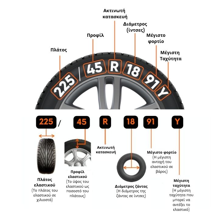 Οι σημάνσεις δίνουν πληροφορίες για το πλάτος, τη σχέση διατομής, τον τύπο κατασκευής, τη διάμετρο του τροχού, το μέγιστο φορτίο και την ταχύτητα του ελαστικού. Για παράδειγμα, το "225/45 R18 91Υ" σημαίνει πλάτος 225 mm, σχέση διατομής 45%, ακτινωτή κατασκευή, διάμετρος τροχού 18 ίντσες, μέγιστο φορτίο 91 και μέγιστη ταχύτητα Y.